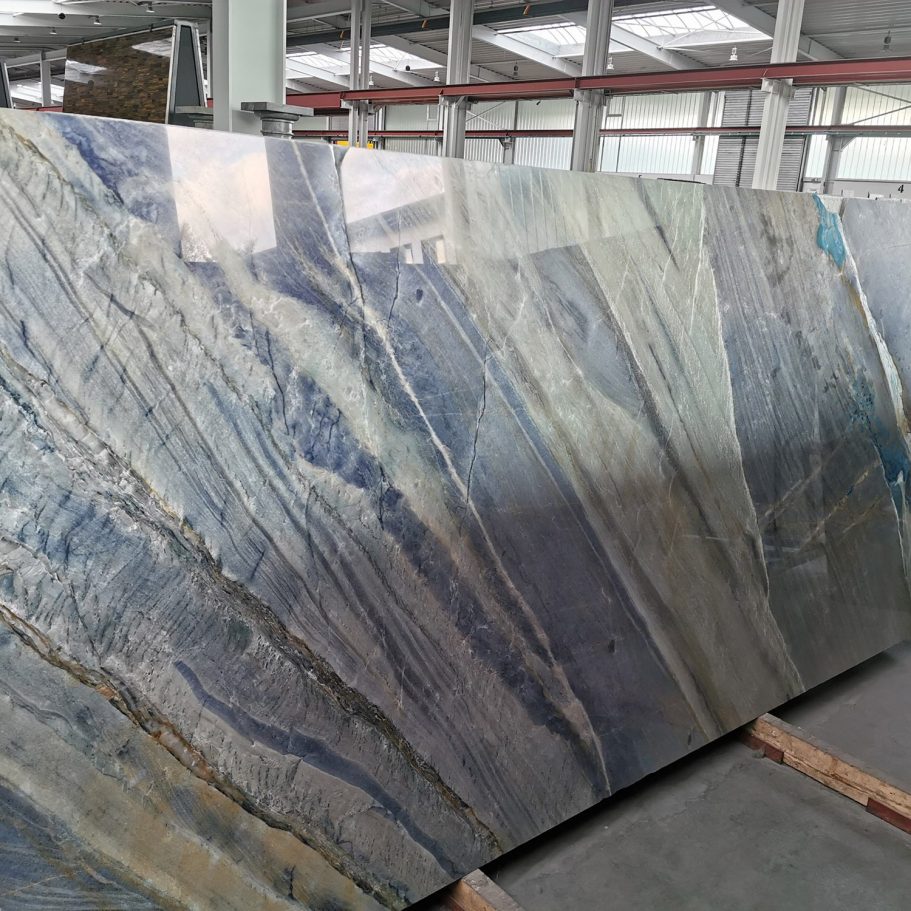 Blauer brasilianischer Quazit, auch bekannt als blauer Quarzit, ist ein beeindruckend schöner Naturstein mit markanten Blautönen. erfreut sich aufgrund seiner Schönheit und Unzerstörbarkeit großer Beliebtheit bei hochwertigen Wohn- und Gewerbebauten. Blauer brasilianischer Quarzit ist ein hochwertiger Naturstein, der Schönheit und Unzerbrechlichkeit miteinander verbindet. Diese Quarzite ist aufgrund ihrer besonderen blauen Färbung und der vielfältigen Maserungen eine hervorragende Wahl für unterschiedliche Anwendungen, sei es für Arbeitsplatten, Bodenbeläge oder Wandverkleidungen.